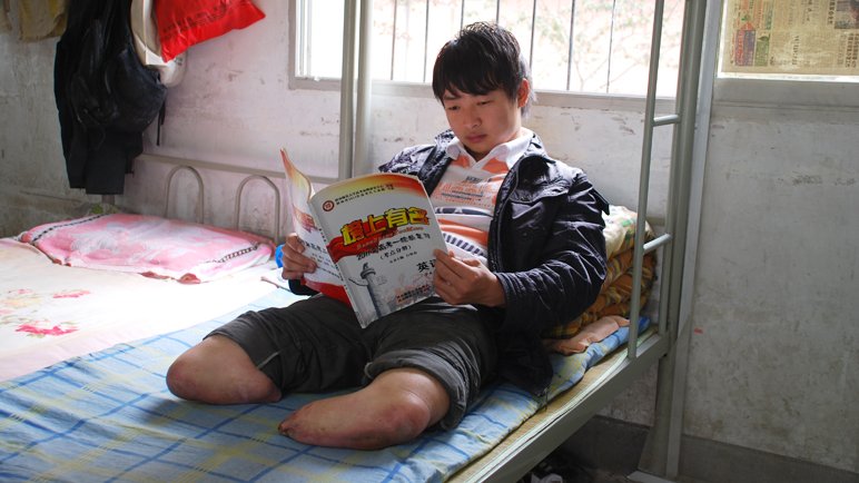 • " 我在假想,如果我有脚的话,我绝对出外打工了。但是失去了一双腿,我获得了高中的知识,感觉到也对自己很欣慰。"