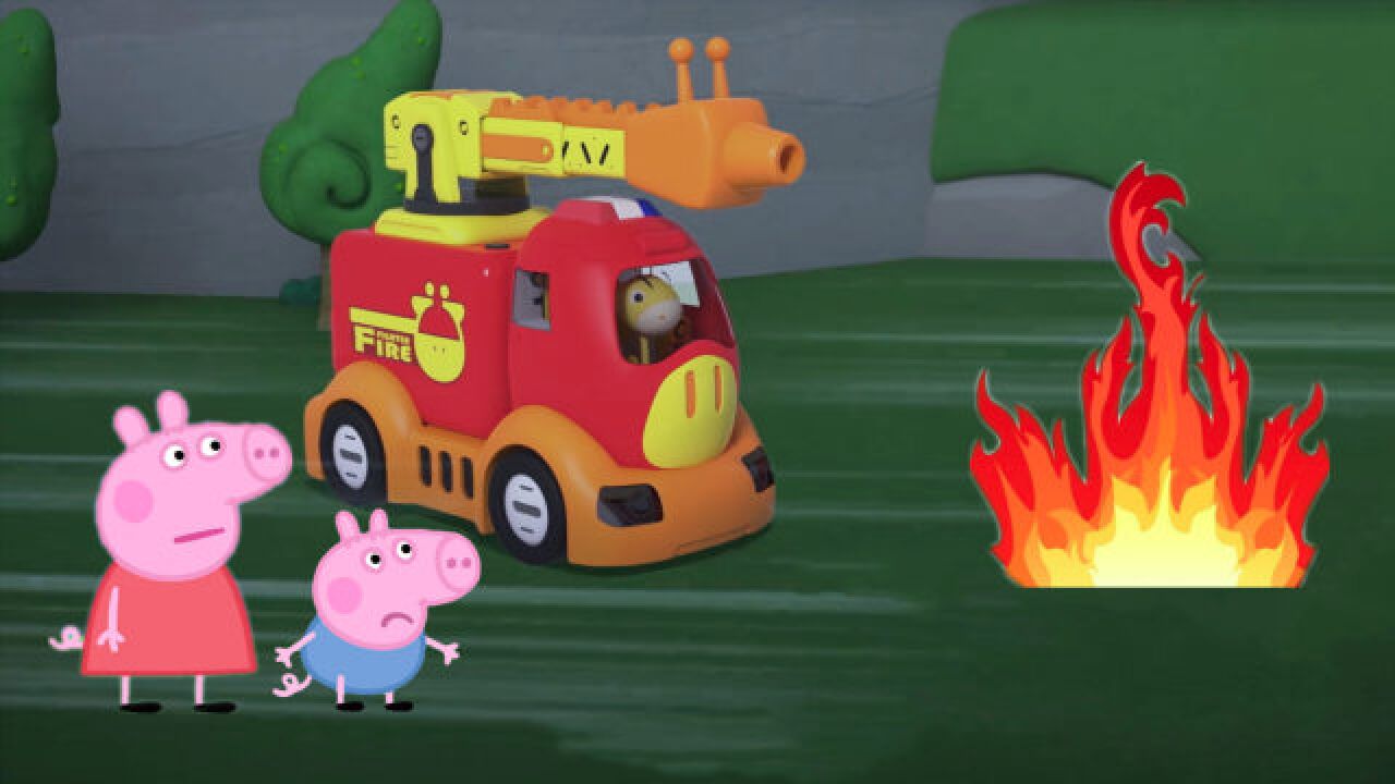 小猪佩奇一家野外烧烤发生火灾,冲冲鹿开消防车火速来救援!